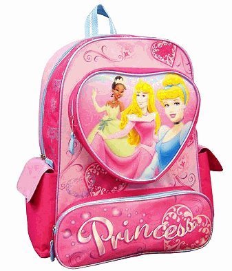 Tote your school stuff with sparkly style! The pink and purple Disney Princess 16" Heart Pocket Backpack features a 3-D picture of Belle, Sleeping Beauty, and Cinderella on the heart-shaped front pocket; "Princess" text and shimmery accents are also displayed, while a large zip compartment, front zip pocket, and side pouch pockets provide great storage for your belongings.