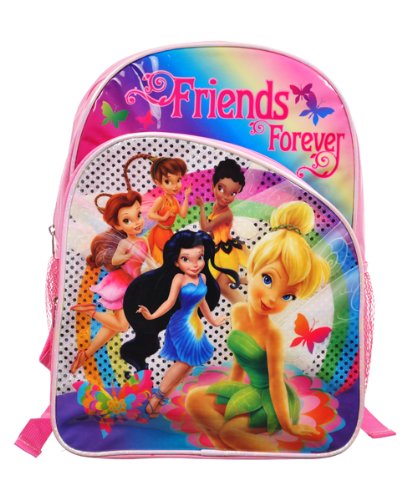 Give her enchantment every day with this Disney Fairies backpack! The spacious main compartment, front pocket, and mesh side pockets hold everything she needs for school and play. The padded, adjustable straps make carrying comfortable. The plasticized graphics feature "Friends Forever" in magical type and the Fairies posed in front of a glitter background. Ages 3 + Made in China