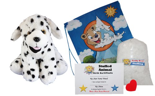 "Domino" the Dalmation - Stands on all 4 feet! This animal has plastic eyes and plastic nose.This un-stuffed plush kit comes with the 15" animal skin, necessary super-soft polyester fiber fill stuffing, a birth certificate, wishing heart insert and an amazing string bag-styled nylon backpack with cartoon bear. This kit comes with all you need to stuff your own plush animal and make a wish that stays inside forever. Make your new friend a part of the family by creating a birth certificate. After making you new friend, dress him or her with an outfit from a huge collection of stuffed animal clothing (sold separately.) The self sealing closure seals your new friend without any need to sew or stitch. Our simple instructions make this project suitable for all ages. Perfect for Birthday parties, fund raisers and scout troup and school activities, gifts for grandchildren or make a wish bear for a military service member. All clothing and accessories sold separately.