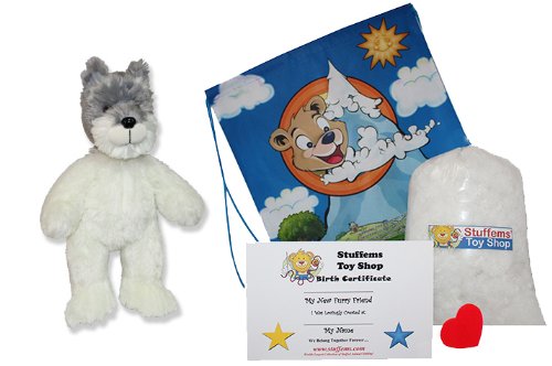 This un-stuffed plush kit comes with the 15" animal skin, necessary super-soft polyester fiber fill stuffing, a birth certificate, wishing heart insert and an amazing string bag-styled nylon backpack with cartoon bear. This kit comes with all you need to stuff your own plush animal and make a wish that stays inside forever. Make your new friend a part of the family by creating a birth certificate. After making your new friend, dress him or her with an outfit from a huge collection of stuffed animal clothing (sold separately.) The self-sealing closure seals your new friend without any need to sew or stitch. Our simple instructions make this project suitable for all ages. Perfect for Birthday parties, fund raisers and scout troop and school activities, gifts for grandchildren or make a wish bear for a military service member. All clothing and accessories sold separately.