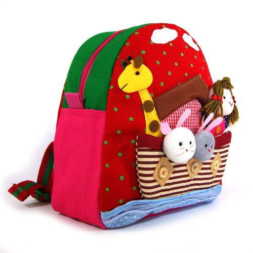 My Little Puppet Handcrafted Backpack for Kids Toddlers, Giraffe Bunnies & Little Girl in Noah's Ark - Red