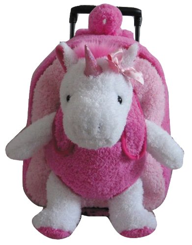 This interactive pink trolley backpack features a white unicorn. The adjustable handle locks at the right height. For playtime the penguin unstraps from the bag. The bag is removable from the frame.