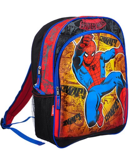 Pack your little one up for class with this action-packed Spider-Man backpack! The spacious main compartment, smaller front pocket, mesh water bottle pockets, and adjustable padded straps are perfect for carrying whatever he might need. Comic-inspired graphics of the webslinger in action will make this your little hero's favorite. 11" W x 16" H x 4" D Made in China