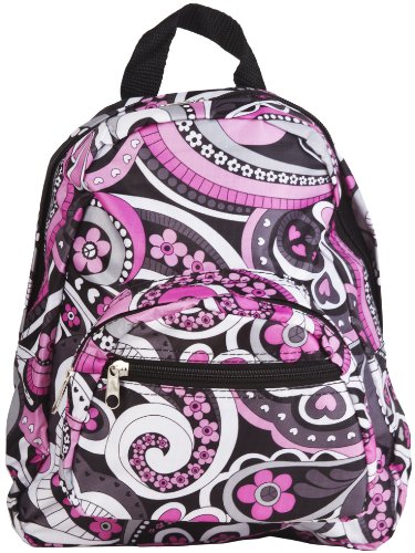This durable microfiber mini backpack is just the thing to keep up with your active lifestyle. In stylish black and pink paisley print, this compact, versatile backpack is great to just throw over your shoulder and go! This petite pack is a cute size for a casual but fun on-the-go purse or perfect for younger kids. Adjustable shoulder straps make sure it fits every frame. Makes an ideal rugged daypack to hold water and snacks for an afternoon hiking excursion. This cute, lightweight bag is linen lined for easy cleaning and the zipper main enclosure keeps your belongings secure while accessible. Features two front zip pockets for easy access to car keys, cell phone or other smaller items.