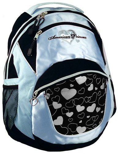 Being glamorous has never been so easy! Flash brilliant style on the go with this vibrant powder blue American Princess Sweethearts school bag! Fashionistas and trendsetters alike will be raving about this elegant and chic backpack! The main compartment provides plenty of storage space for homework, books and binders. Once all of the large items are tucked away, store all other small items in the front zipper pocket for incredibly easy access. Carry this bag comfortably with the state-of-the-art, s-shaped adjustable padded shoulder straps. Lightweight and durable, this Sweethearts bag allows anyone to effortlessly get from class to class. Beat the heat and drink up! The 2 mesh water bottle holster pockets provide great thirst-quenching storage space for water to keep you hydrated. Do you constantly listen to tunes? Don't miss a beat with the innovative heart-shaped headphone exit port! It will let you to keep your music with you at all times! American Princess does it again in bringing style and class to your backpack. The Sweethearts series combines modern age chic and retro class and takes them to a whole new level. Stay stylish and captivating always, whether you're heading to school or just enjoying the day.