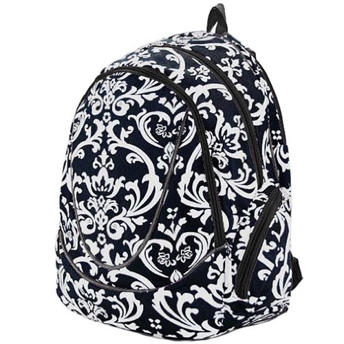 Size : 12w x 16h x 5d in.Material : CanvasDescription:* Zipper Closure* Plenty of Various Sized Pockets Inside* Two Compartments w/ Front Pocket* Polka Dot Lining* Backpack for School