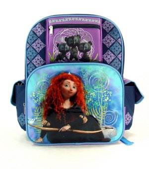 Brave movie Princess Merida licensed Disney backpack with characters: Hamish, Harris, and Hubert as bear cubs. Colorful bow and arrow portrait under clear plastic 3-D motif. Front zipper pockets. Flap pockets on sides. 16in(H)X12in(W)X5in(D).