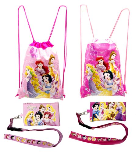 4 PACK DISNEY PRINCESS DRAWSTRING BACKPACK AND LANYARD WITH DETACHABLE COIN PURSE