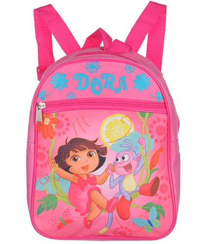 She'll love taking this lively Dora the Explorer backpack on her everyday adventures. It has adjustable shoulder straps, a hanging loop, a zippered main compartment, and a smaller zippered compartment on the front. The graphic shows Dora and Boots holding hands and sitting on a vine swing. 8" W x 10" H x 4" D Made in China