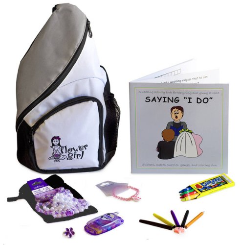 - The Flower Girl Backpack features an image of a girl in a party dress, holding a basket of flowers. It measures 9.5" x 15.5" x 4" and is black, white, and gray, with a touch of purple. The flower girls purple headband and flowers add a feminine accent while keeping the backpack neutral enough to blend easily with any wedding color scheme. This modern sling pack has a side mesh water bottle pocket (bottle not included), front zippered pocket, and an adjustable shoulder strap. The backpack is made from 600d polyester and is kid-friendly/CPSIA compliant.