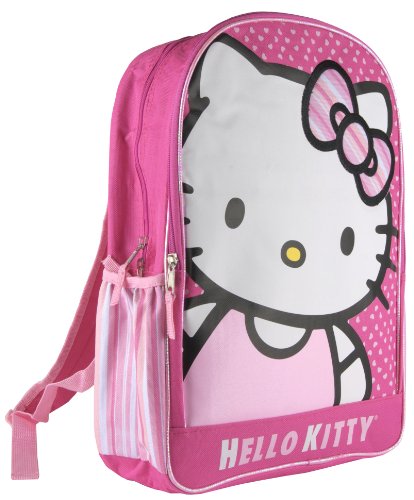 This Hello Kitty "Hearts & Stripes" backpack can easily carry books, gym clothes, pencils and more! Hello Kitty "Hearts & Stripes" daypack features a roomy main compartment and a front zip compartment that is perfect for smaller supplies. The sides feature mesh pockets that are great for storing a calculator, note cards or even a water bottle. Hello Kitty "Hearts & Stripes" book bag can be hung up when not in use by the webbed locker loop. Back pack is designed in pink durable fabric with accents of white with an adorable image of the sweet Hello Kitty! The perfect back to school choice for any Hello Kitty fan!