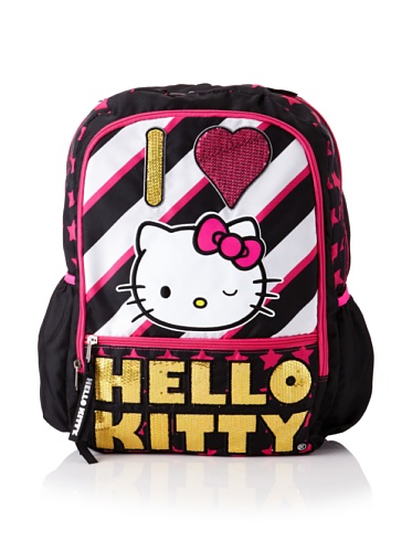 Get ready for school with this cute I Love Hello Kitty Pink and Gold Sequined Backpack. The kitty face is winking and outlined with black embroidery. Two front zip pockets.