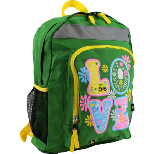 This John Deere "Love" backpack can easily carry books, gym clothes, pencils and more! John Deere "Love" day pack features a roomy main compartment and a front zip compartment that is perfect for smaller supplies. Front compartment features pouches for pencils and supplies. The sides feature mesh pockets that are great for storing water bottles or other accessories. Constructed from durable fabric in the traditional John Deere green and yellow with pink and blue accents, this John Deere book bag has adjustable padded shoulder straps and a reflective strip across the front, and it can be hung by the woven loop when not in use. This John Deere girls backpack is perfect for back to school and anywhere else!