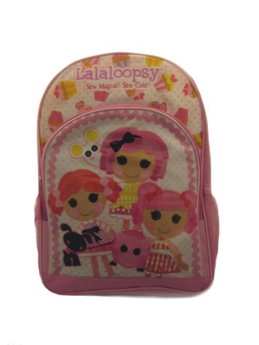 This full sized officially licensed Lalaloopsy backpack is sure to be a hit, Carried to school, camp, or just for everyday fun. This red and pink back pack features your favorite Lalaloopsy friends in shimmer inlay on the front, It boasts "Lalaloopsy" type in light purple, "Sew Magical, Sew Cute! type in red. In addition to three of your favorite Lalaloopsy friends, there are three more of your favorite characters in shimmer, on front of backpack. The large main compartment has a zipper closure, and there is one medium sized front pocket, also with zipper closure, for quick, easy storage. Two mesh pockets located on each side of back pack great for storing water bottles. Two pink with light pink trim, padded straps for maximum comfort.