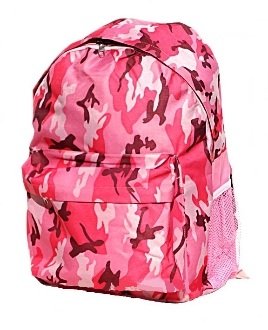 Shoot straight to the head of the class in style with this cute backpack. The durable, rugged canvas main compartment is padded to handle all the note books and binders you can throw in it comfortably and keeps things in their place with a zipper closure. A fully lined linen interior makes cleanup of accidental broken pens easy! The front zipper compartment makes for easy organization of pens and pencils or other easy to lose items. Features a top handle that can be used to hang this pack easily by a locker hook and has a side mesh pocket perfect for a water bottle. Thick, padded, and adjustable straps make for a perfect fit that can comfortably carry heavy text books. In a fashionable pink camouflage, it makes a chic statement piece of luggage for vacations as well.