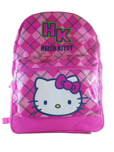 Hello Kitty Face Pink Argyle 16 inch Back to School Backpack Back Pack. This adorable backpack measures about 12 by 5 by 16 inches and features a front compartment, 2 side mesh pockets, and a large main compartment. Perfect for starting the school year don't miss out on this one of a kind bag!
