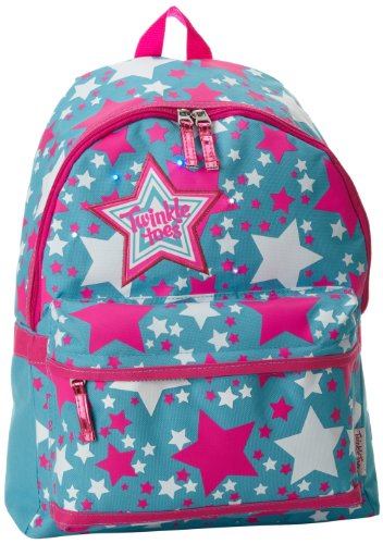 This stylish backpack features a roomy main compartment and a front utility pocket to keep essentials handy. the multi-color star pattern on a turquoise-blue background incorporates a twinkle toes star patch that twinkles for the cool, fashionable girl.