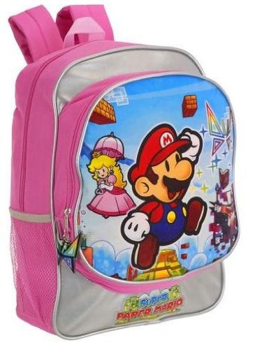 Dazzle your pals with the Nintendo Super Paper Mario Backpack. This pink pack features silver accents and a full-color, shimmery Super Paper Mario picture. A large zip compartment, front zip pocket and side mesh pockets are perfect for holding school supplies.The Nintendo Super Paper Mario Backpack - Pink features:* Includes 1 backpack* Pink backpack is decorated with metallic silver accents and a full-color, shimmery image of some of the Super Paper Mario gang* A large zip compartment, front zip pocket and side mesh pouches hold all of your gear* A Tippi zipper pull is featured on the front pocket* Padded, adjustable straps offer a custom fit* Cushioned back is extra comfy* Top loop allows easy hanging* Durable fabric and lining hold up for extended use* Dimensions: 16 x 12 x 5 inches