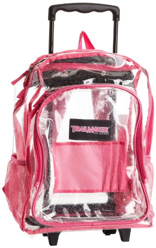 Trailmaker clear rolling 17 inch backpack with two mesh side pockets and padded straps
