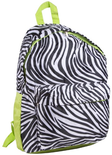 Shoot straight to the head of the class in style with this cute backpack. The durable, rugged canvas main compartment is padded to handle all the note books and binders you can throw in it comfortably and keeps things in their place with a zipper closure. A fully lined linen interior makes cleanup of accidental broken pens easy! The front zipper compartment makes for easy organization of pens and pencils or other easy to lose items. Features a top handle that can be used to hang this pack easily by a locker hook and has a side mesh pocket perfect for a water bottle. Thick, padded, and adjustable straps make for a perfect fit that can comfortably carry heavy text books. In a fashionable zebra print with lime green trim, it makes a chic statement piece of luggage for vacations as well.